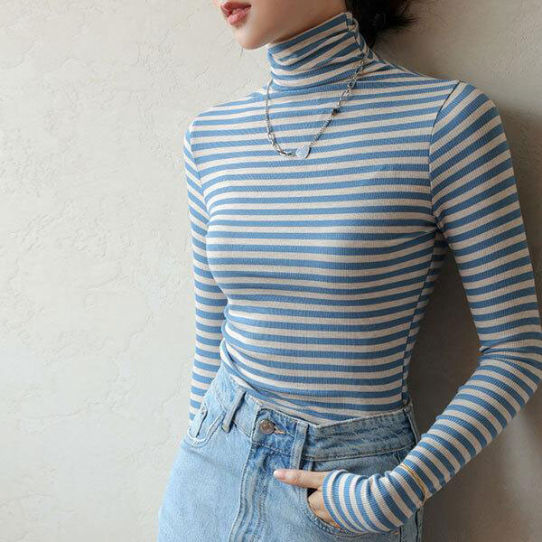 【セール】即納 安い レディース リブ タートルネック ボーダー Tシャツ カットソー 長袖 トップス ハイネック 首元 通気性 ...