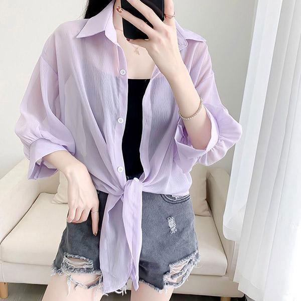 【セール】即納 安い レディース シフォンシャツ 七分袖 前結び シアー素材 薄手 透け感 ゆったり ふんわり レイヤードスタイル...