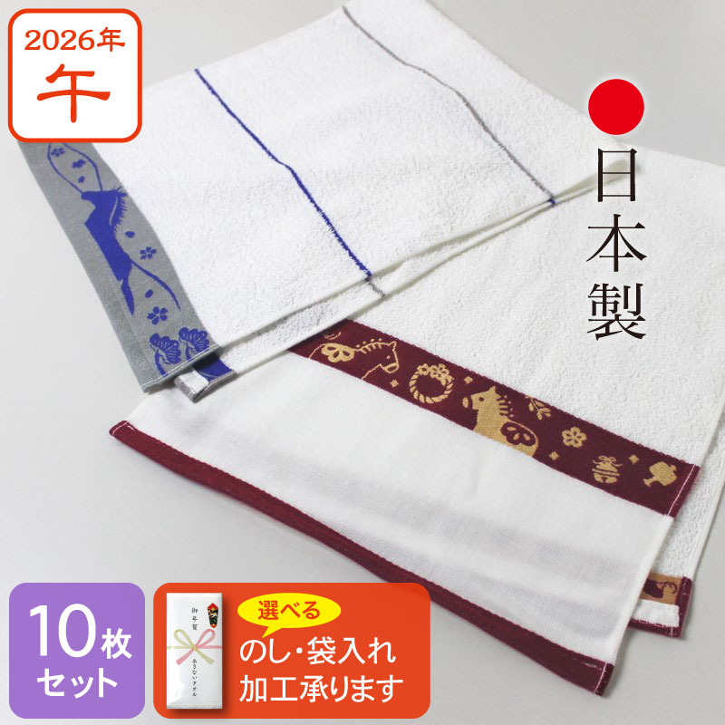 【日本製】干支タオル お年賀タオル 朱子織ジャカード 2026年 午年 馬 粗品 ご挨拶 泉州産・同柄10枚セット