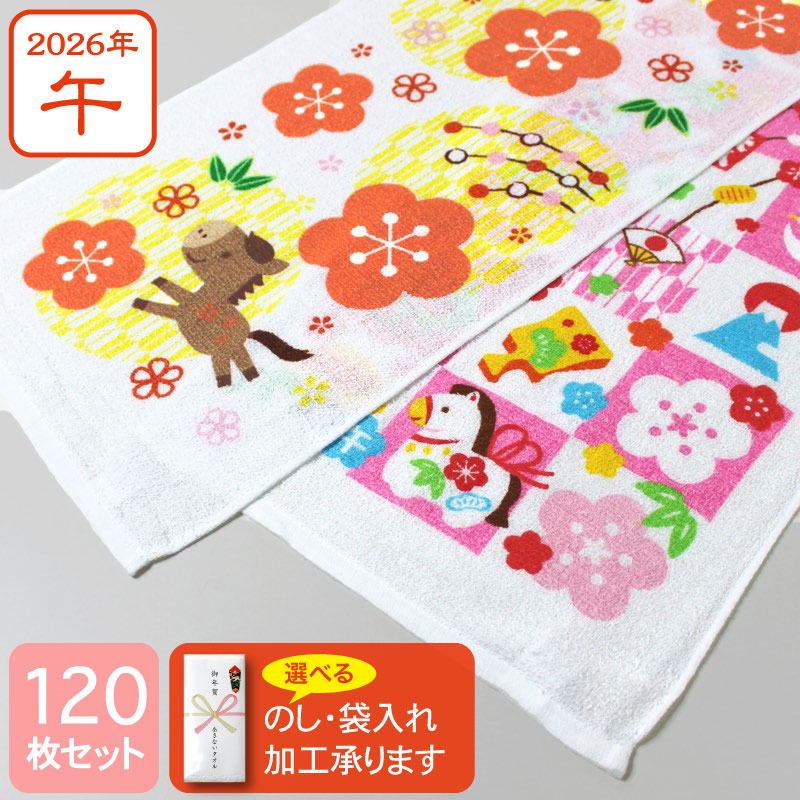 干支タオル お年賀タオル (花もち格子/矢柄うま) 2026年 午年 馬 粗品 ご挨拶・同柄120枚セット