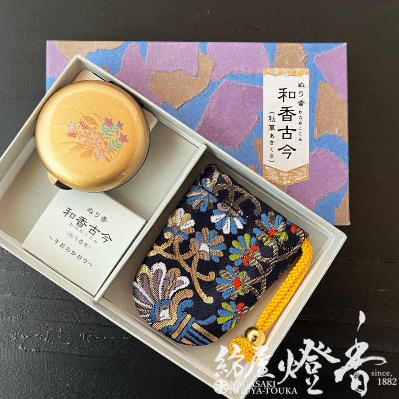 ぬり香/練り香水『和香古今(わのかここん)【牛若の香り/秋草柄/紺色巾着】化粧箱入り』長川仁三郎商店