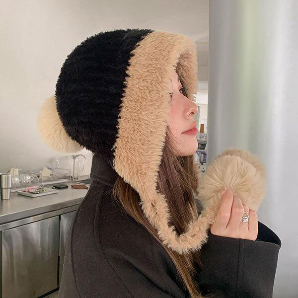 レディース ウィンターハット ポンポン付き フリーサイズ ニット帽 フード ニットキャップ 帽子 ふわふわ モコモコ 保温性 防寒...