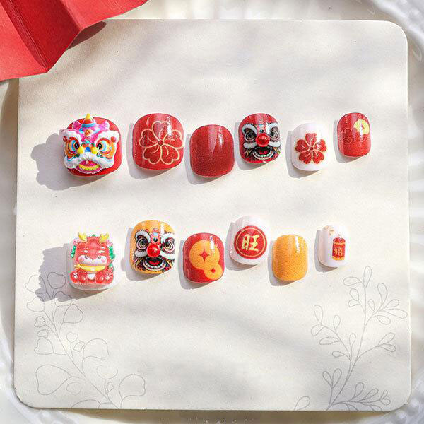 子供用 ネイルチップ 中華風デザイン 12枚セット 赤獅子 小さい爪 デザイン済 ネイルシール つけ爪 チャイニーズテイスト