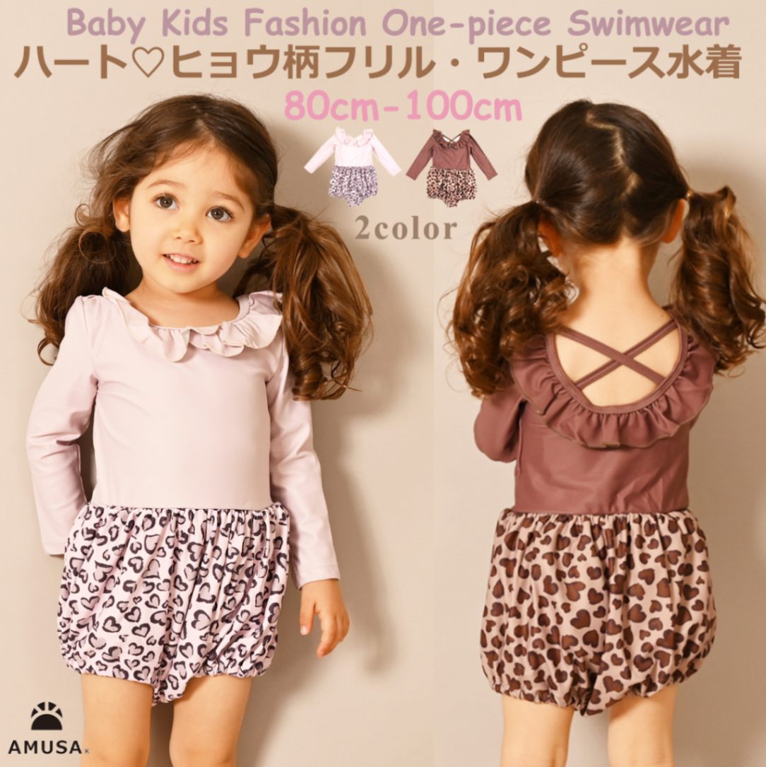 【宅配送料無料】ハートヒョウ柄バックシャンワンピース水着 UVカット ジュニア水着 キッズ水着 女の子水着