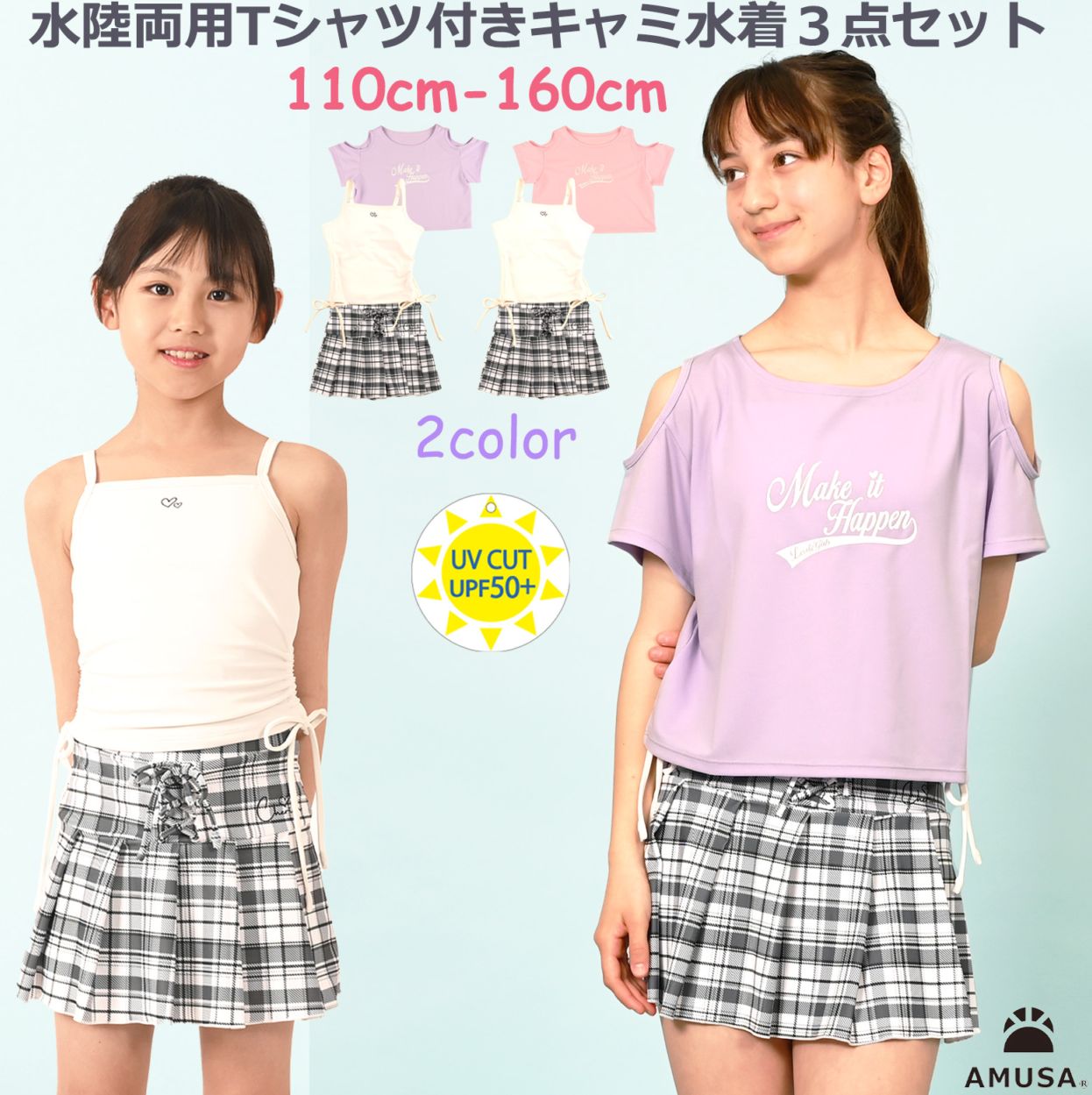 UVカット水陸両用Tシャツ付きキャミ水着3点セット おしゃれジュニア水着 キッズ水着 女の子