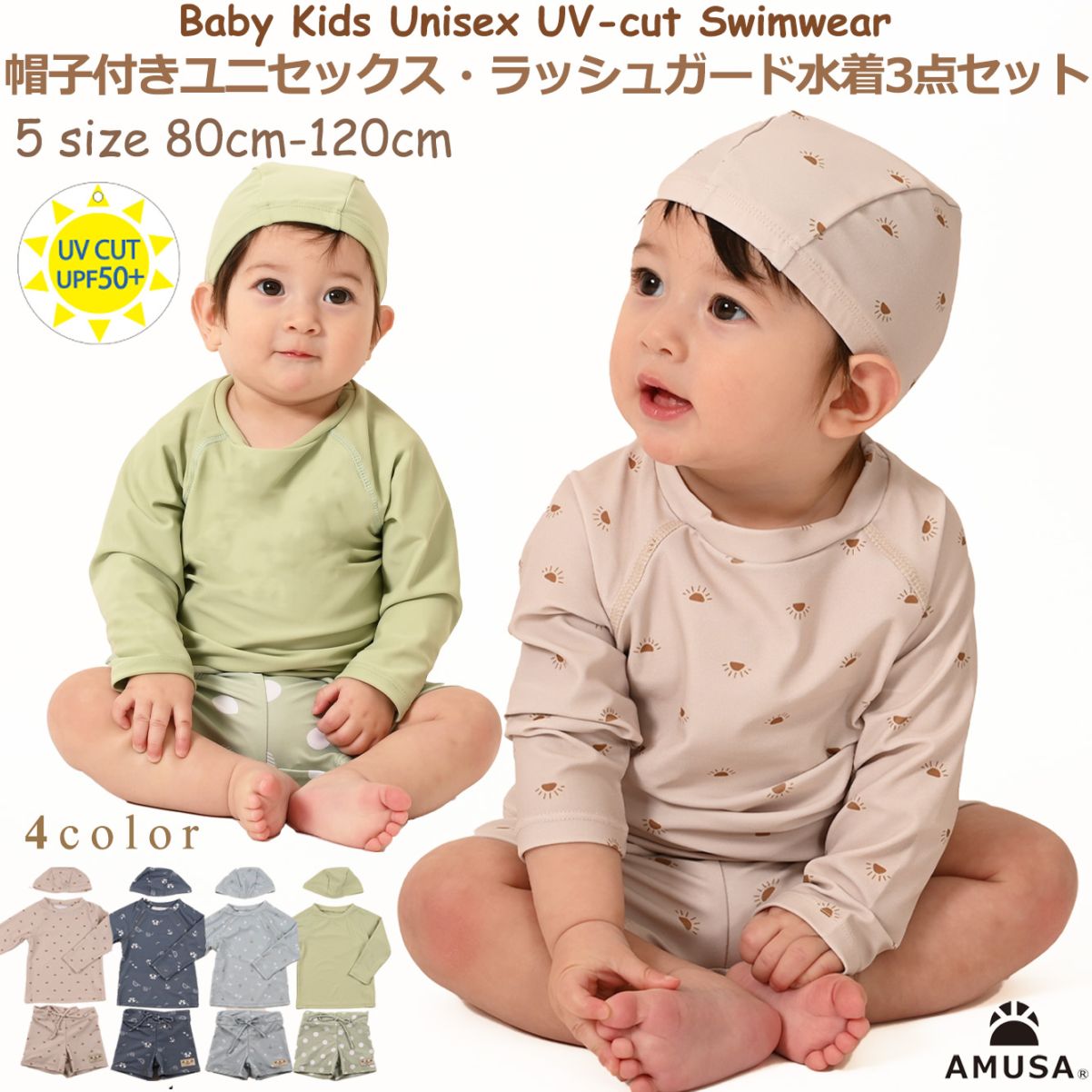 ユニセックス長袖ラッシュガード水着・帽子付き3点セット キッズ水着 男の子 女の子 赤ちゃん ベビー