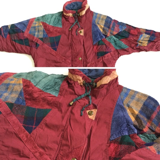 IZZI アメリカ直輸入 中綿ジャケット パッチワーク 送料無料 レディース S/小豆色x多色 チェック柄 ウール コーデュロイ ...