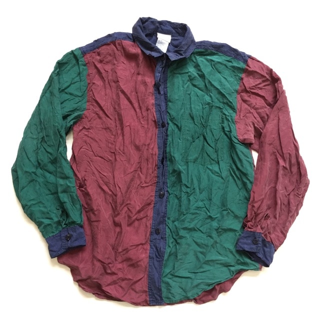 Backroad BLUES アメリカ直輸入 長袖シャツ シルクシャツ 送料無料 レディース M/紺x緑x小豆 クレイジーパター...