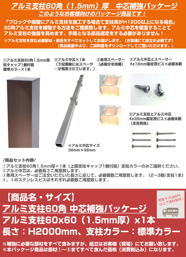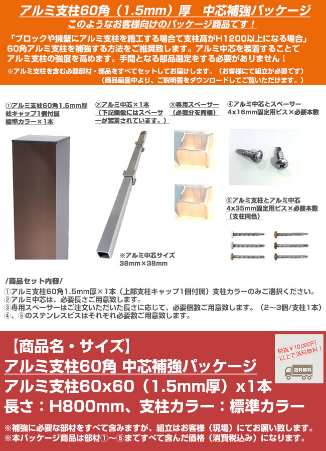 【目隠しフェンス スタイルフェンス用】アルミ支柱60角補強部材 商品名:アルミ支柱60角 1.5mm厚/中芯補強パッケージ H10...