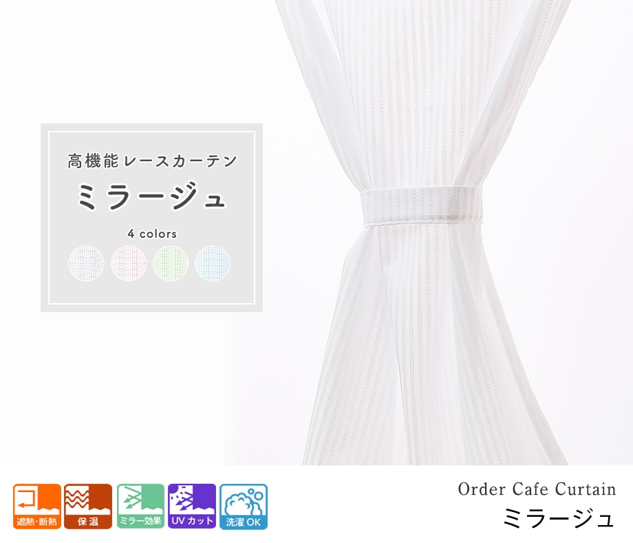 縫い目のようなストライプのUVカットミラーレースカフェカーテン「ミラージュ」ホワイト