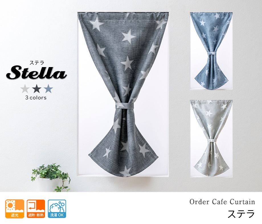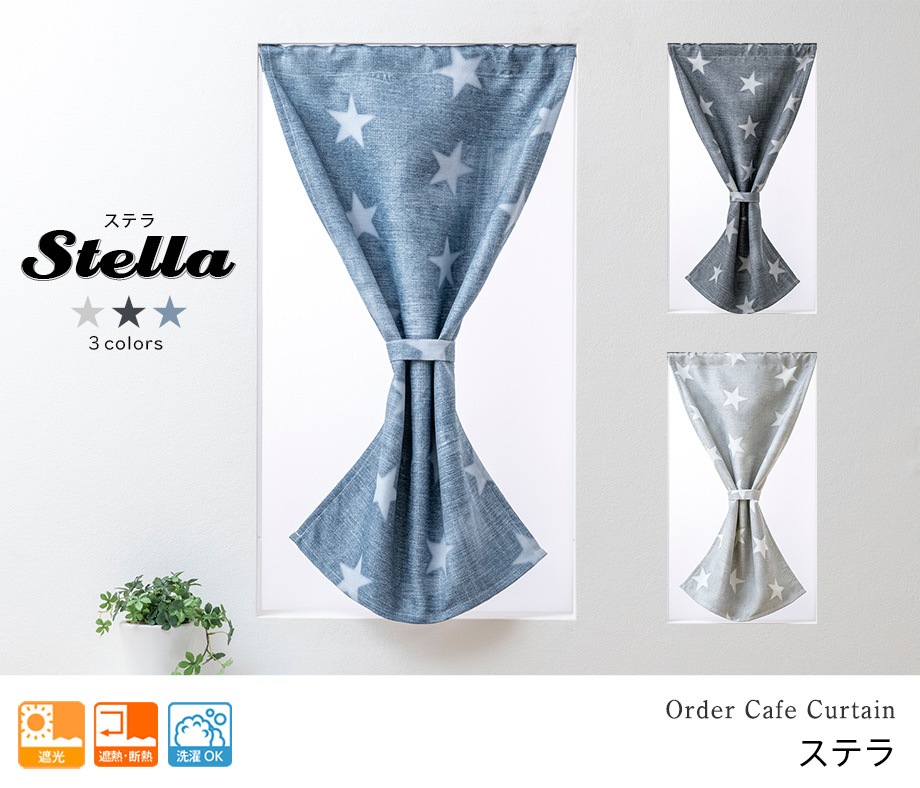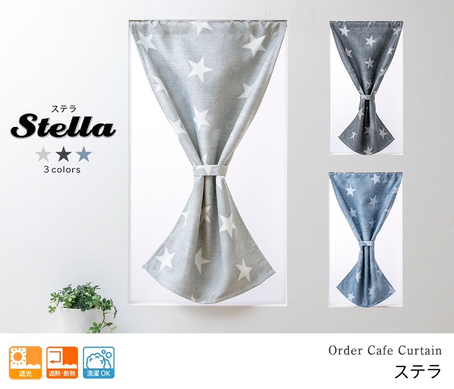 星をモチーフにしたスタイリッシュなデザインの2級遮光カフェカーテン「ステラ」グレー