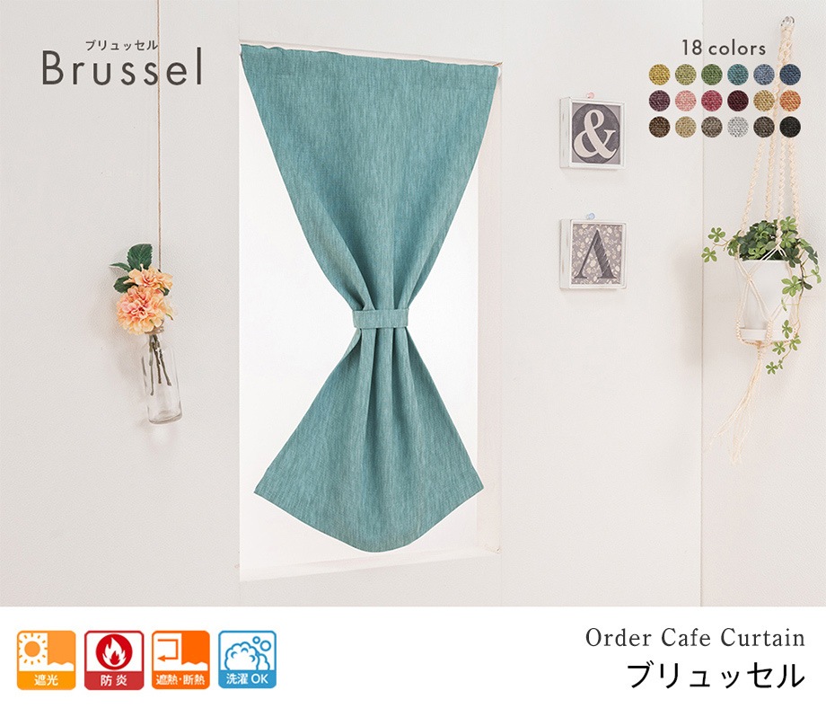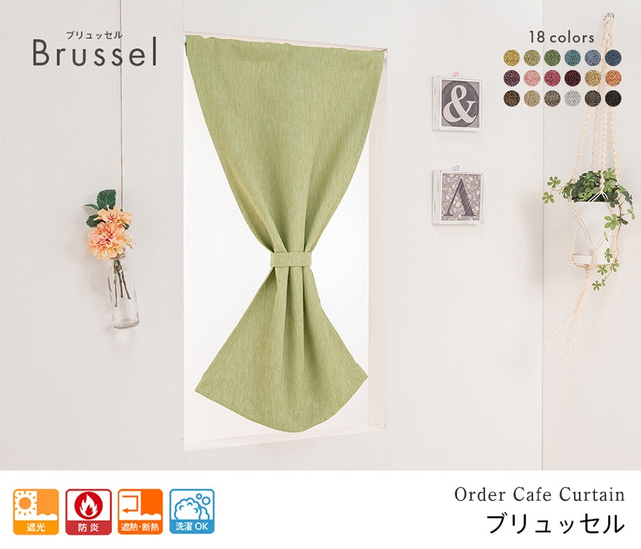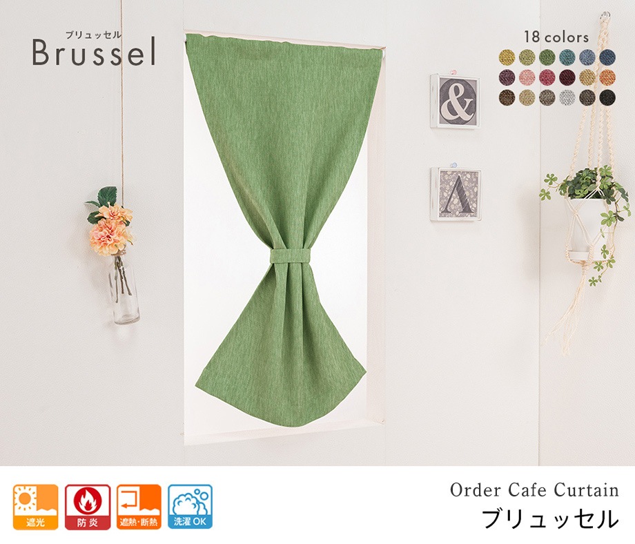 ナチュラルな質感と色合いを持つ杢調生地のオーダー防炎遮光カフェカーテン「ブリュッセル」グリーン(1級遮光)