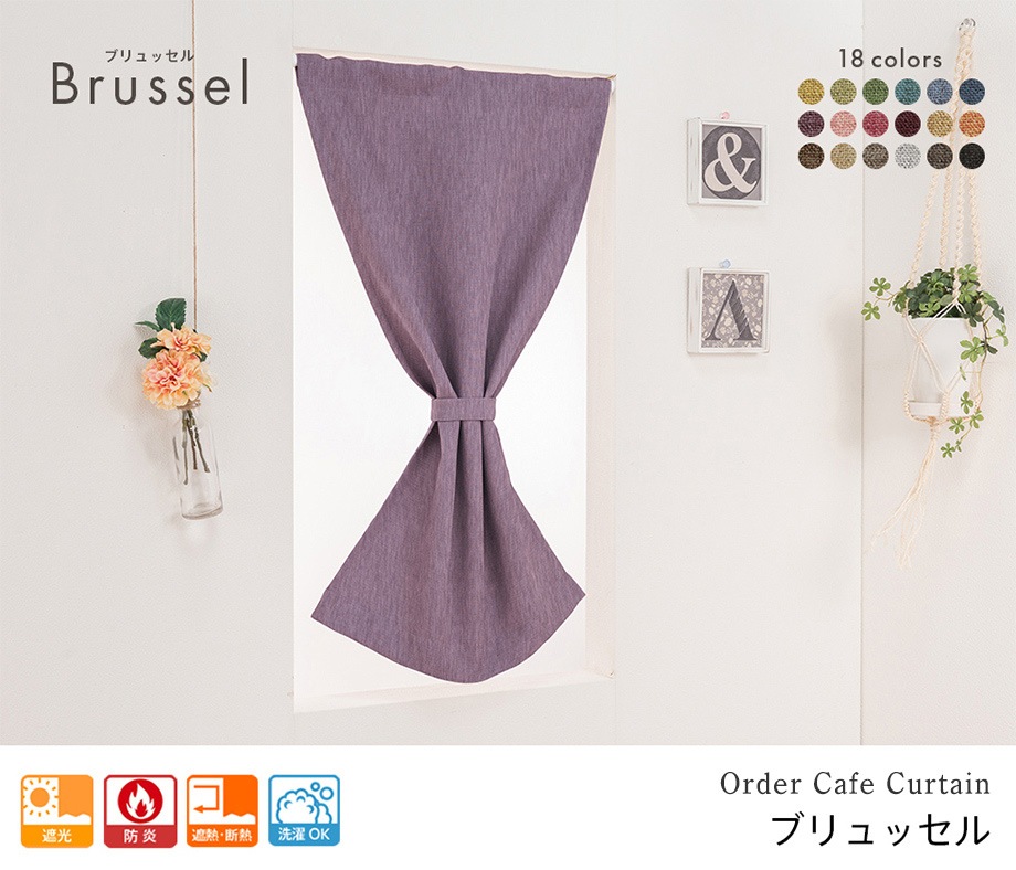 ナチュラルな質感と色合いを持つ杢調生地のオーダー防炎遮光カフェカーテン「ブリュッセル」パープル(1級遮光)