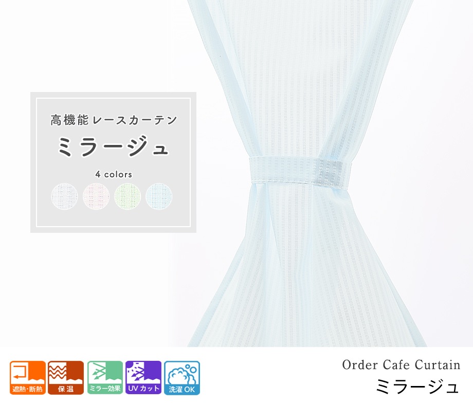 縫い目のようなストライプのUVカットミラーレースカフェカーテン「ミラージュ」ブルー