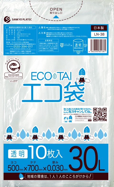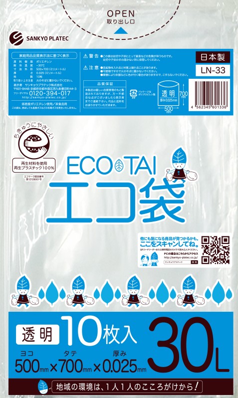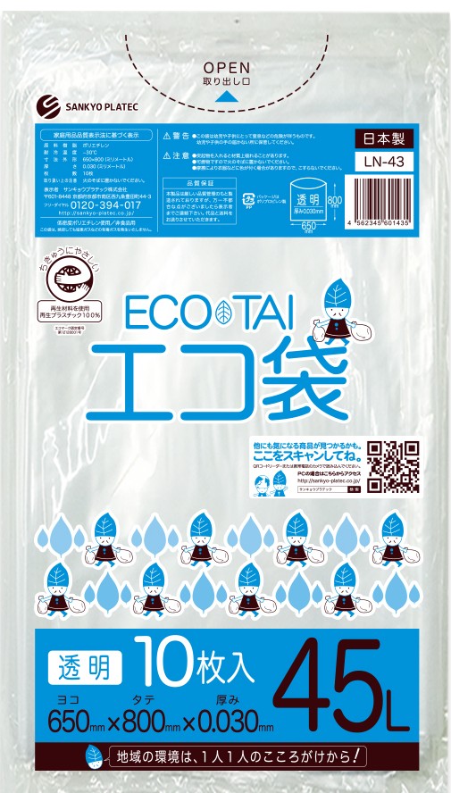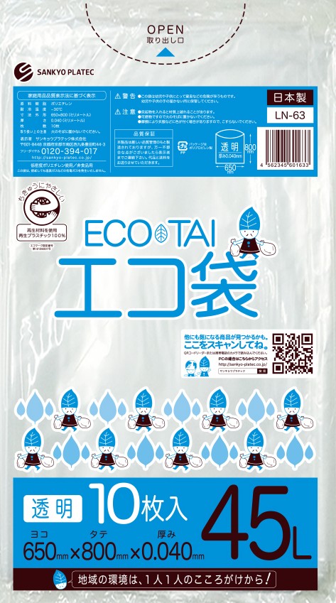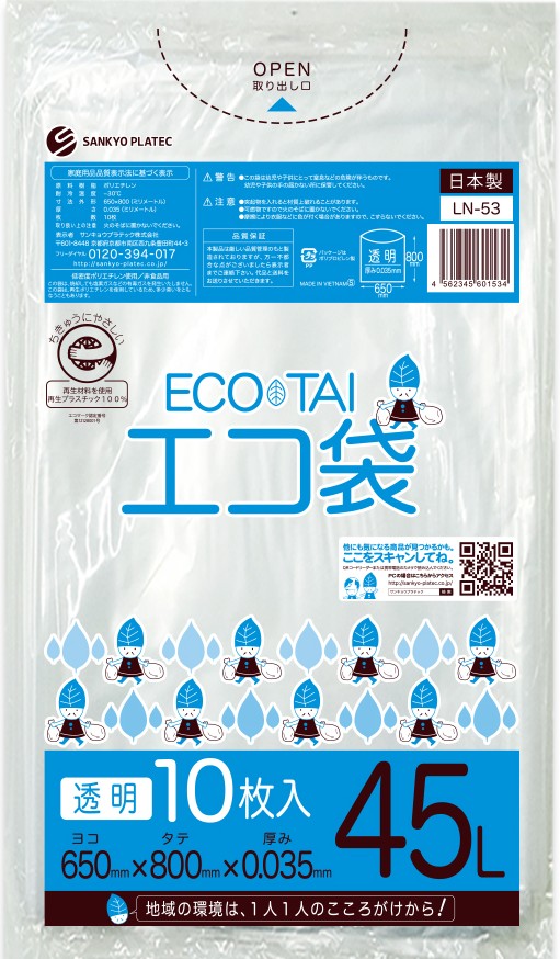 エコマーク付き ゴミ袋 45リットル 透明 0.030mm厚(10枚×60冊)