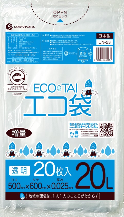 エコマーク付き ゴミ袋 20リットル 増量タイプ 透明 0.025mm厚(20枚×60冊)