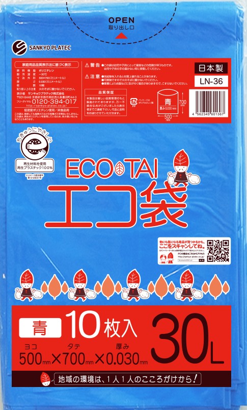 エコマーク付き ゴミ袋 30リットル 青 0.030mm厚(10枚×100冊)