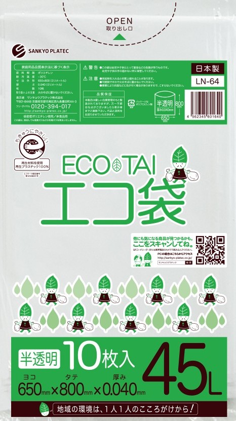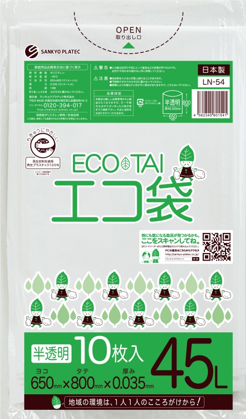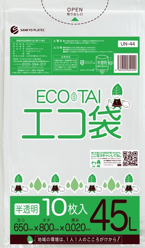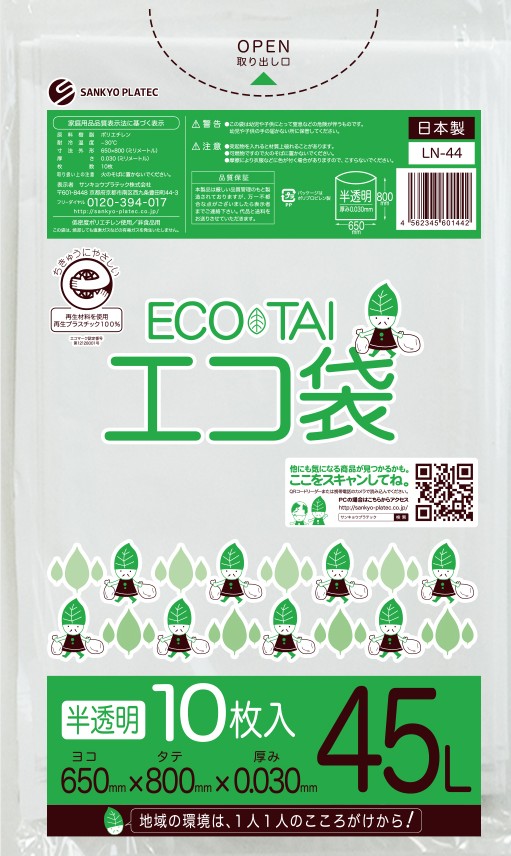 エコマーク付き ゴミ袋 45リットル 半透明 0.030mm厚(10枚×60冊)