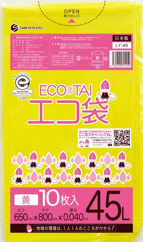 エコマーク付き ゴミ袋 45リットル 厚手 黄 0.040mm厚(10枚×40冊)