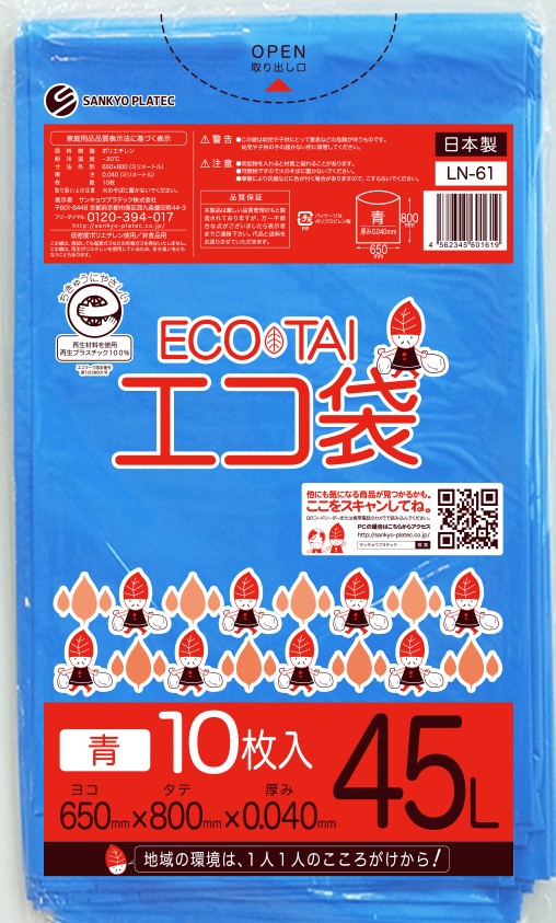 エコマーク付き ゴミ袋 45リットル 青 0.030mm厚(10枚×60冊)