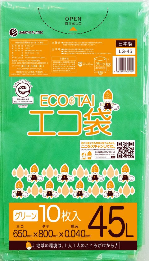 エコマーク付き ゴミ袋 45リットル 厚手 緑 0.040mm厚(10枚×40冊)