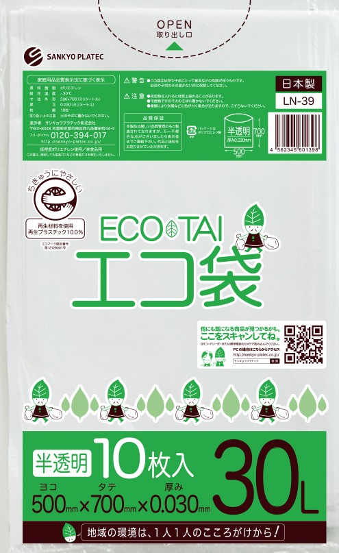 エコマーク付き ゴミ袋 30リットル 半透明 0.030mm厚(10枚×100冊)