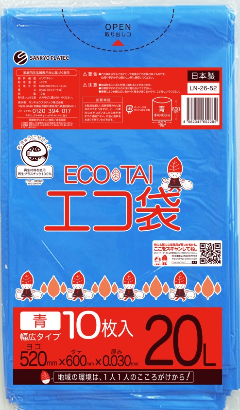 エコマーク付き ゴミ袋 20リットル 幅広タイプ 青 0.030mm厚(10枚×60冊)