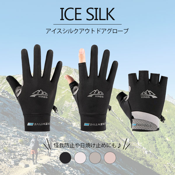【セール】【即納】アイスシルク アウトドアグローブ フルカバータイプ フィンガーレス メッシュ 薄手 UVカット 通気性 耐摩耗性...