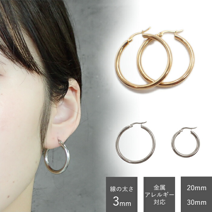 【【【メール便送料無料 】】】ステンレス フープピアス 3mm幅(内径 20mm 30mm)1ペア 金属アレルギー対応 大きめ ...