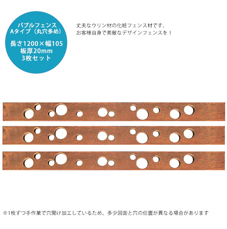【腐らない天然木】ウリン製バブルフェンス用板材(Aタイプ丸穴多め・3枚セット) L1200mm×W105mm×板厚20mm【化粧用...