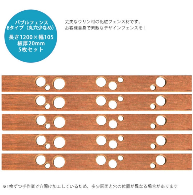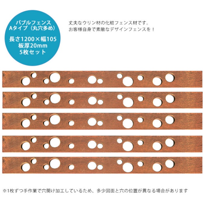 【腐らない天然木】ウリン製バブルフェンス用板材(Aタイプ丸穴多め・5枚セット) L1200mm×W105mm×板厚20mm【化粧用...
