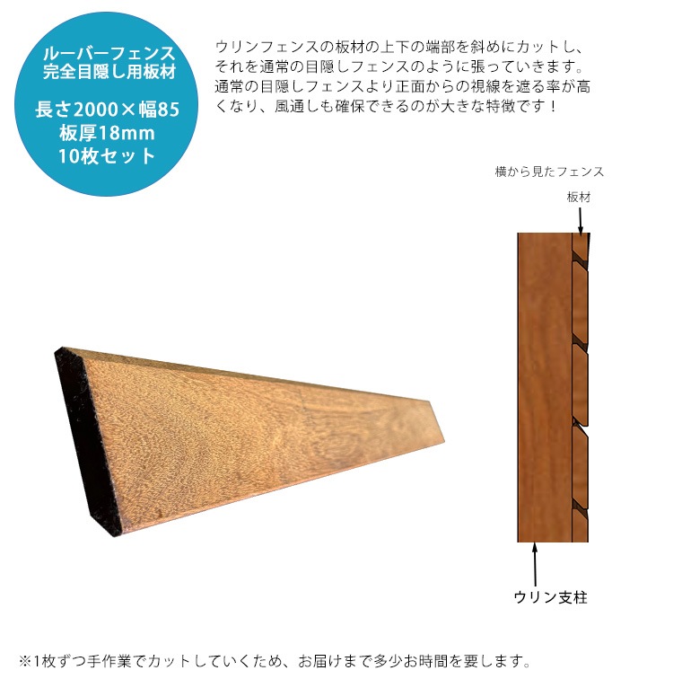 【腐らない天然木】ウリン製ルーバーフェンス用板材(10枚セット) L2000mm×W85mm×板厚18mm ※横張り板材上下を斜め...