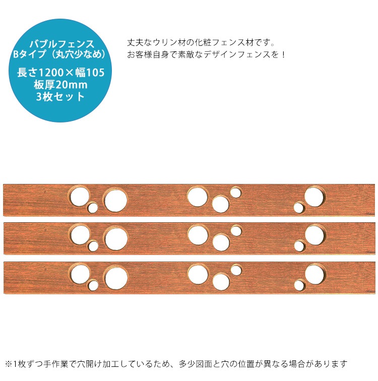 【腐らない天然木】ウリン製バブルフェンス用板材(Bタイプ丸穴少なめ・3枚セット) L1200mm×W105mm×板厚20mm【化粧...
