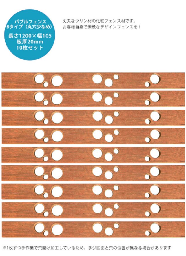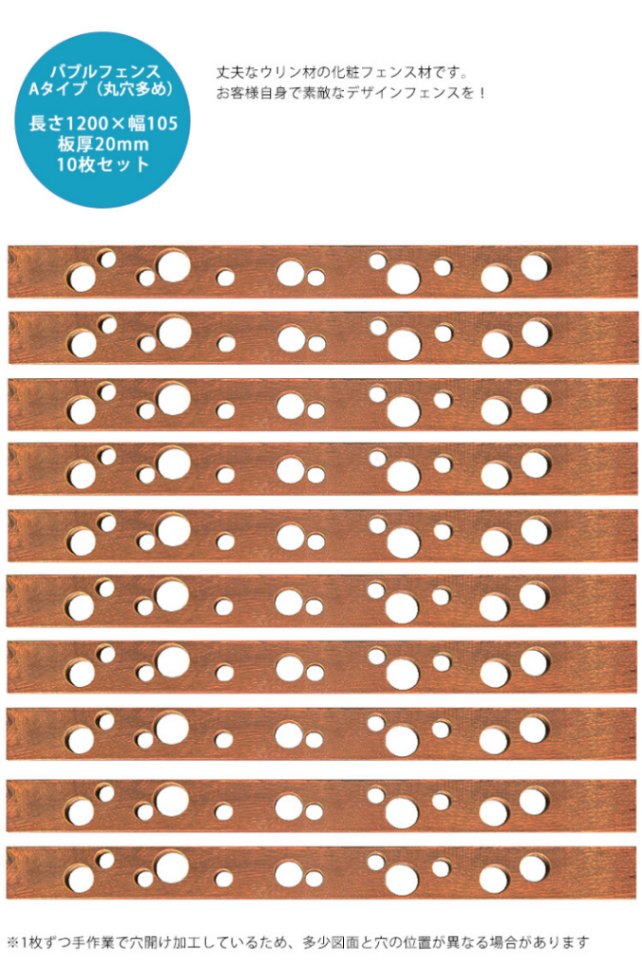 【腐らない天然木】ウリン製バブルフェンス用板材(Bタイプ丸穴少なめ・10枚セット) L1200mm×W105mm×板厚20mm【化...