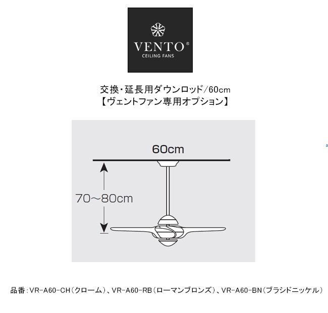 交換・延長用ダウンロッド/60cm/品番:VR-A60-CH(クローム)、VR-A60-RB(ローマンブロンズ)、VR-A60-B...
