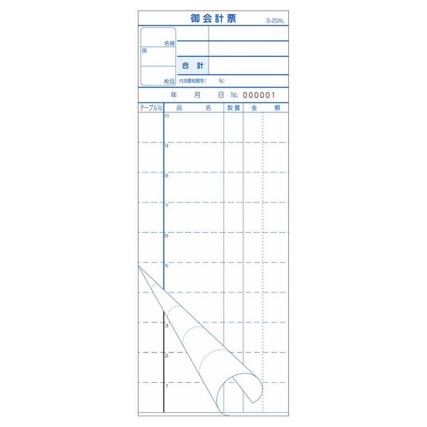 【全国送料無料】会計伝票 御会計票 S-20AL 2枚複写・ミシン10本 番号入 No.1~5000 50組×100冊【取り寄せ商...