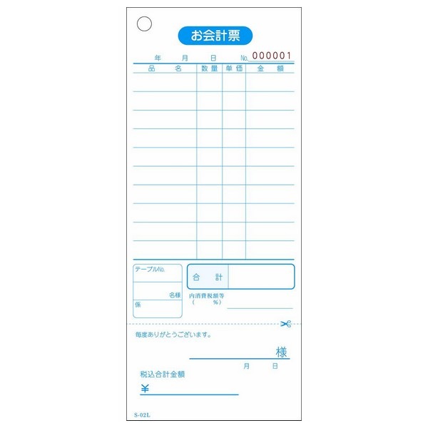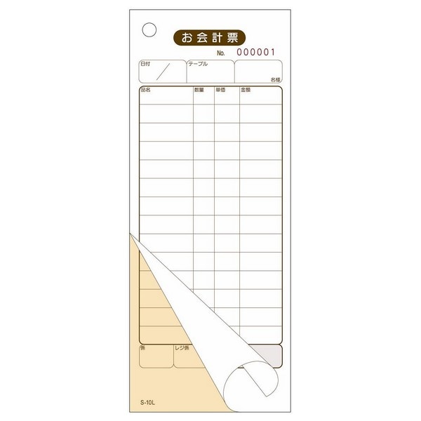 【全国送料無料】会計伝票 お会計票 S-01L 単式・12行 番号入 No.1~10000 100枚×100冊