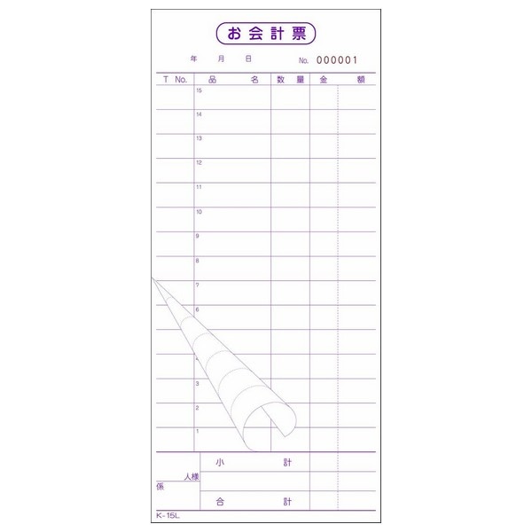 【全国送料無料】会計伝票 お会計票 K-15L 2枚複写・ミシン15本 番号入 No.1~5000 50組×100冊【取り寄せ商品...