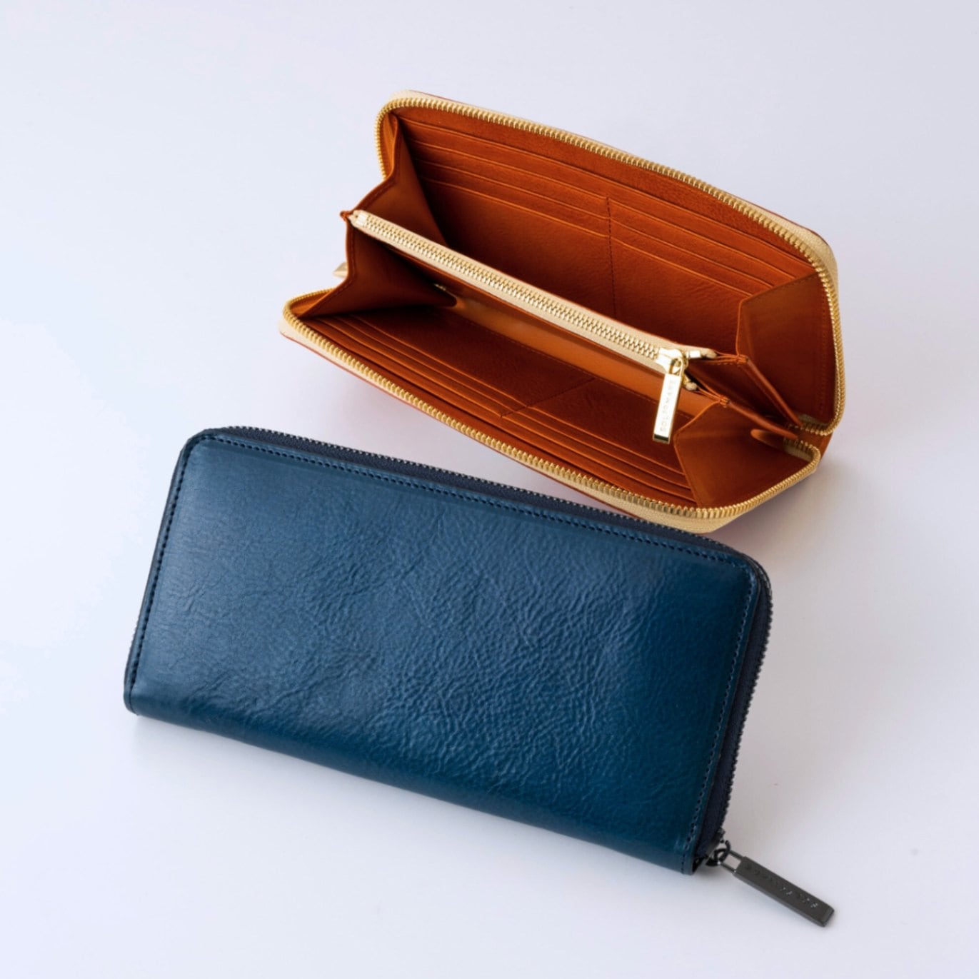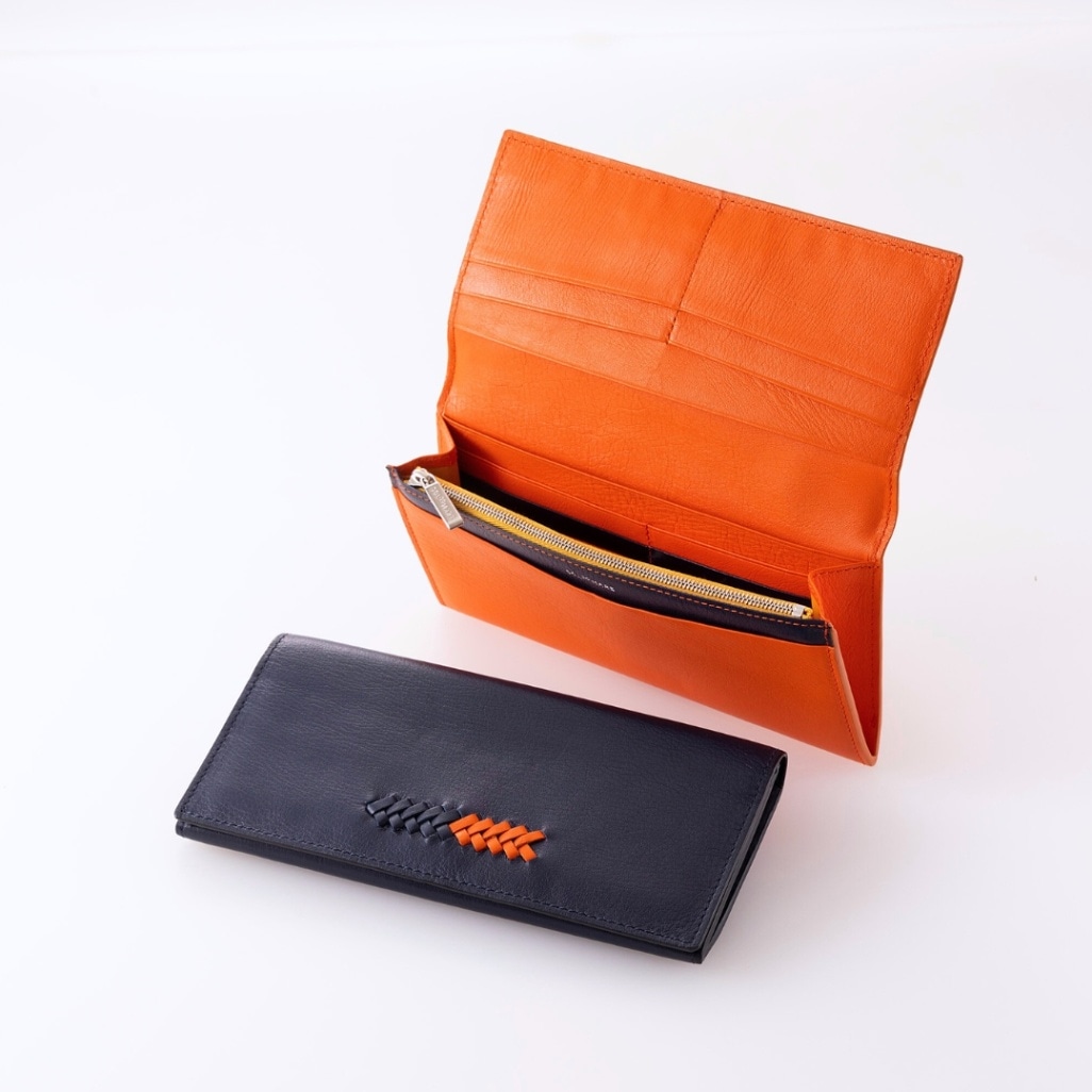 キテンゲ 本革長財布 28(ブルー×オレンジ)L字ファスナー