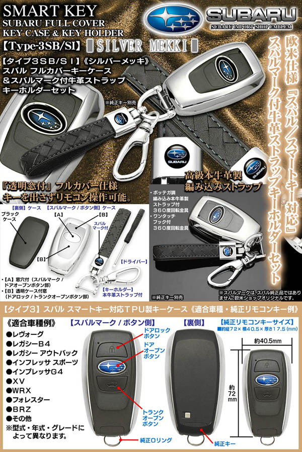 タイプ3SB/SI【スバル/シルバーメッキ】スマートキー対応TPU製フルカバーキーケース&スバルマーク付牛革ストラップ キーホルダ...