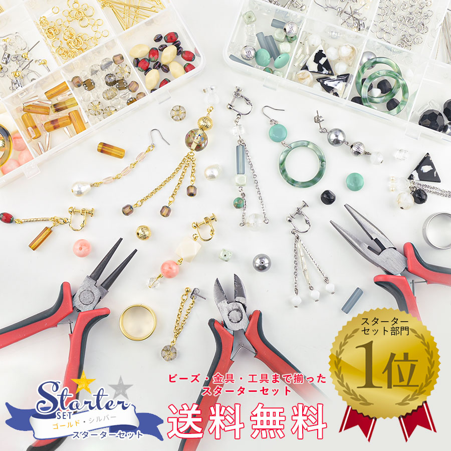 【イヤーアクセサリー スターターセット】【色をお選びください】【金具9種類+ビーズ19種類+工具4種類+ケース付き】