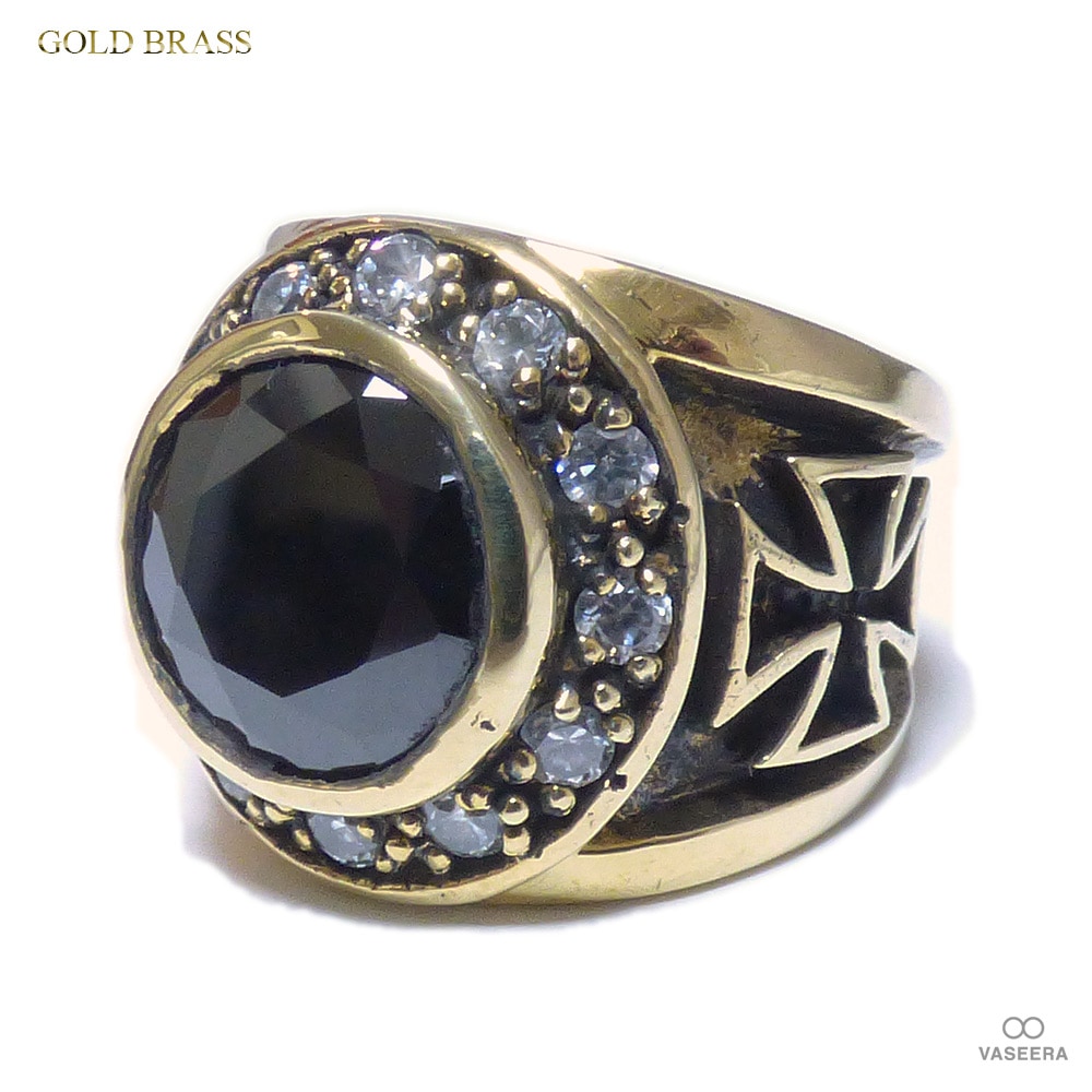 10mmカットブラックジルコニア 埋込みジルコニア装飾 クロス・パティ ゴールドブラス(真鍮) リング 【GOLD BRASS /...