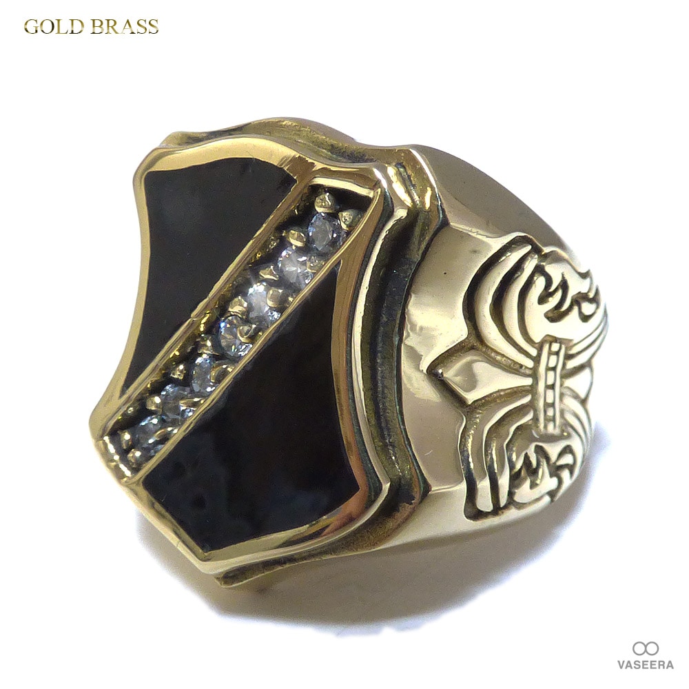 オニキス埋込みエスカッシャン(盾型) ジルコニアベンドデザイン ユリ紋章彫刻仕上げ ゴールドブラス(真鍮) リング 【GOLD B...