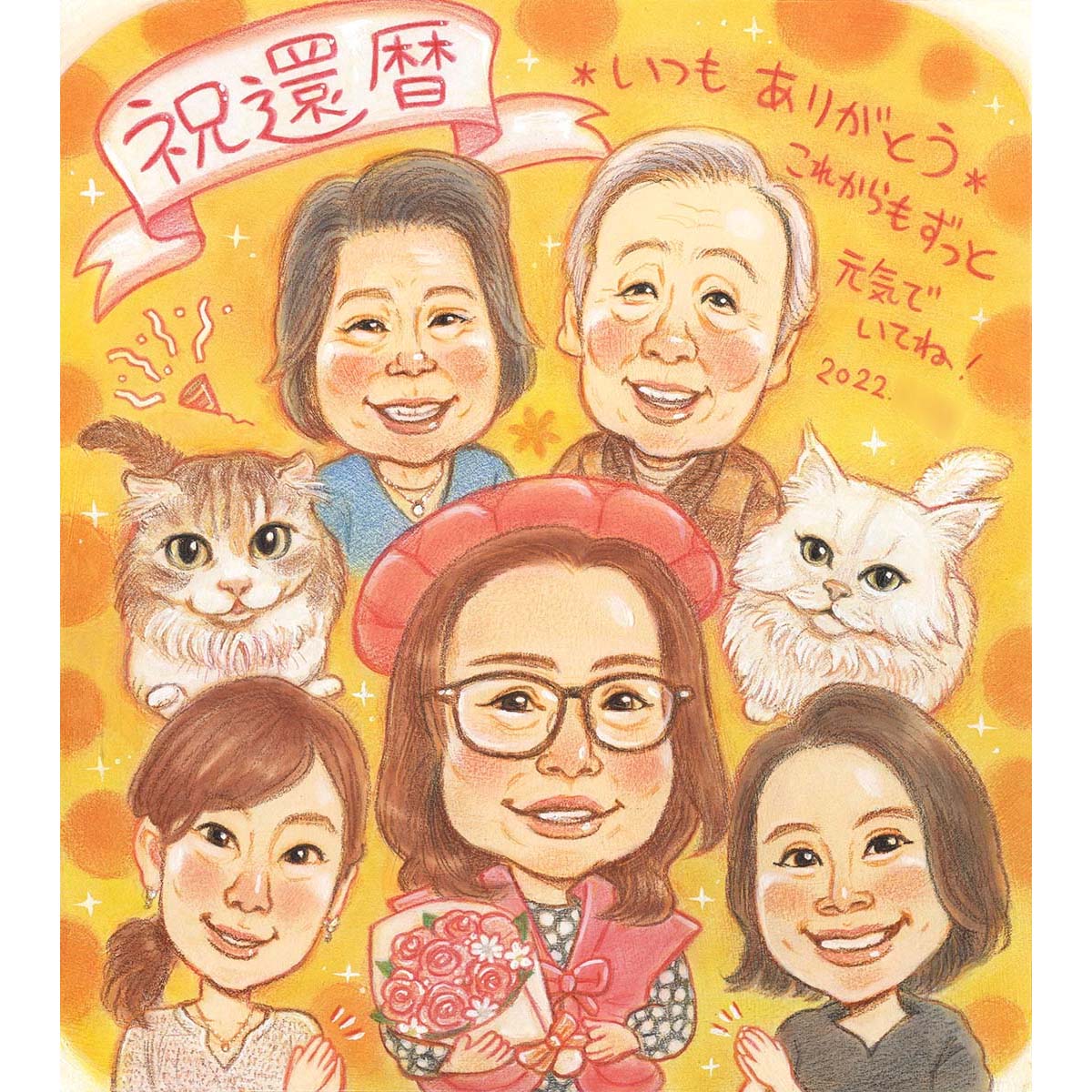 家族で還暦祝うなら!ペットの猫ちゃんも可愛く描きます! ずっと飾っておけるプレゼント 似顔絵 お祝い ギフト 贈り物 家族 ファミ...