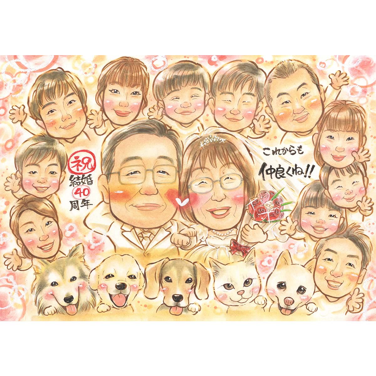 家族みんなが幸せな記念日になる似顔絵プレゼント 結婚40周年に柴犬や猫、ウサギなどペットも一緒に描けます 愛犬や愛猫、ハムスターや...