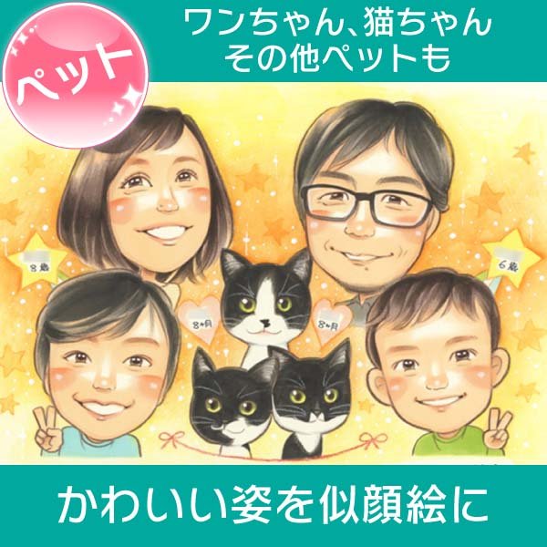 家族になったペットたちの似顔絵ギフト 癒し系プレゼントにおすすめ 犬や猫、うさぎなどのペットの似顔絵家族写真 結婚式のギフトにも ...