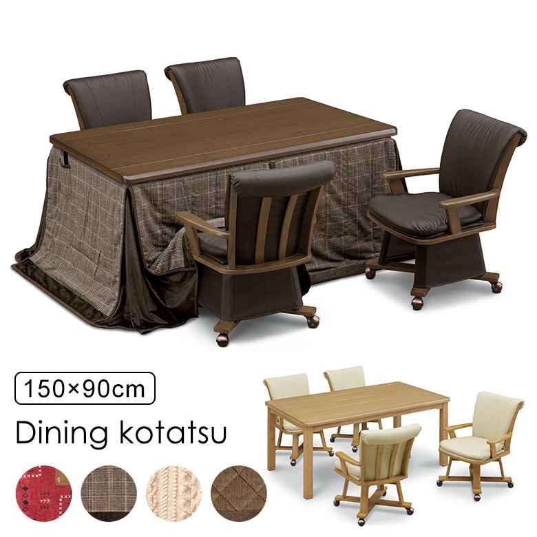 ダイニングこたつ 6点セット 幅150×90cm 回転チェア 肘付き キャスター付き ブラウン ナチュラル 布団セット UV塗装...