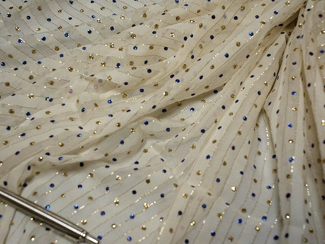 閉店大セール お買得 【シルク シフォンジョーゼット ラメ・ドット.・ストライブ】 フランス製 輸入生地 オフ白/ゴールド/ブルー...