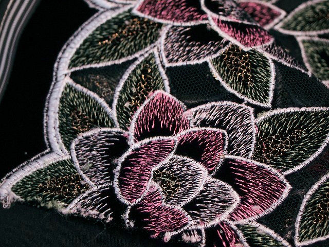 閉店処分大セール お買得 【チュール/ベルベット ハンドカット/レース 大輪花柄】 日本製生地 黒/グリーン/ラメ系 90cm巾3...