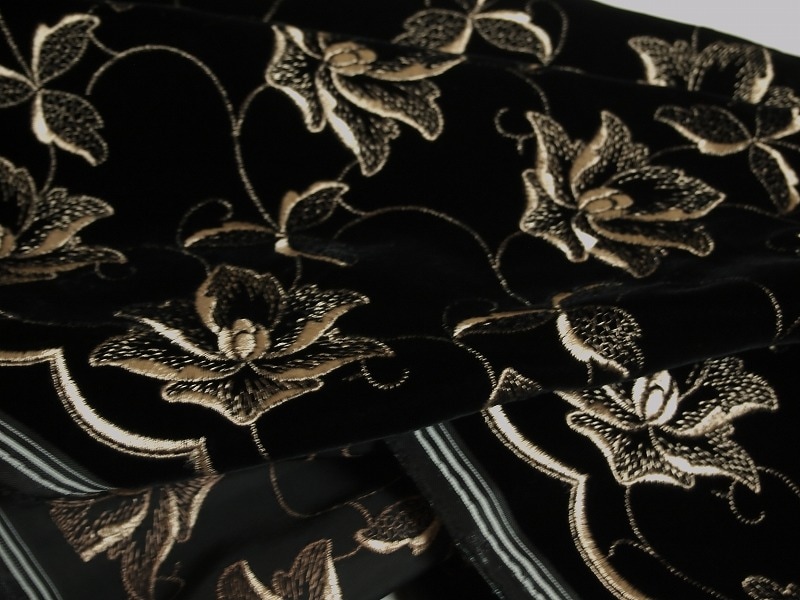 閉店処分大セール お買得 【ベルベット/オールオーバー/レース】 日本製生地 黒/刺繍 金茶 90cm巾4.5m 2381-707